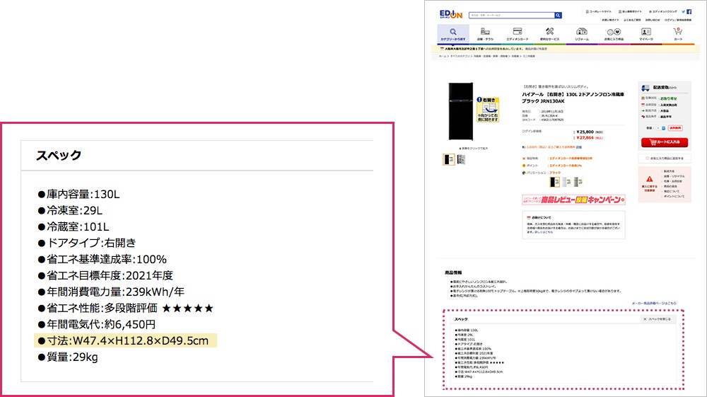 ■商品ページの「スペック」情報やカタログなどに記載の寸法で欲しい冷蔵庫・洗濯機のサイズをご確認下さい。