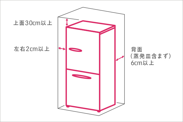 - 下図のように冷蔵庫の周辺にすき間をあけて、放熱がよくできるようにして下さい。