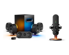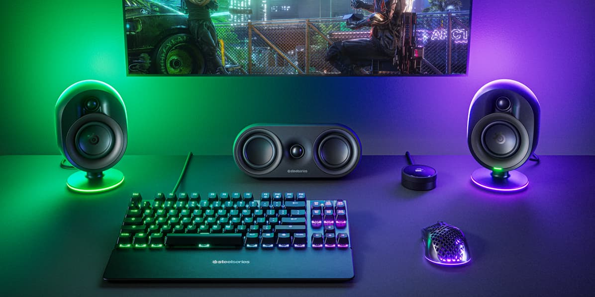 SteelSeries ゲーミング スピーカーは PC、Mac、または PlayStation と互換性があり、ゲームに最適な RBG ライティングと最高のオーディオを提供します。