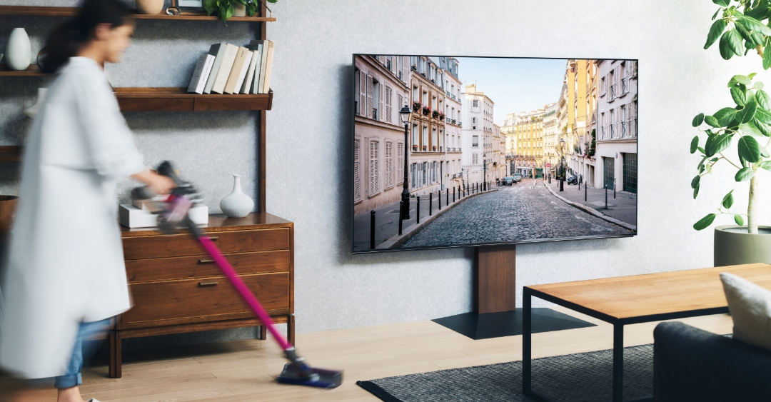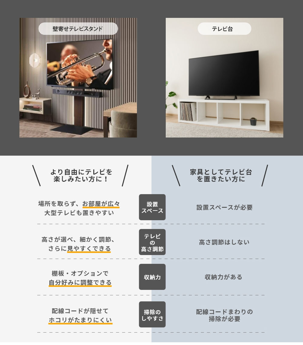 テレビ台だと設置にスペースが必要ですが、テレビスタンドは壁にピタッと寄せられるため、大きな設置スペースを必要とせず、お部屋の空間は広々。「テレビと壁の一体化」を目指せます。