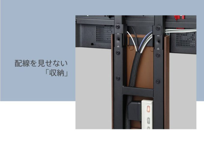 コードはもちろん、マグネット式の電源タップを使うことで、配線は全て裏側にまとめて整理収納が可能。テレビ周りの見た目がスッキリするとともに、ホコリが溜まりにくく、お手入れがぐっとラクになります。